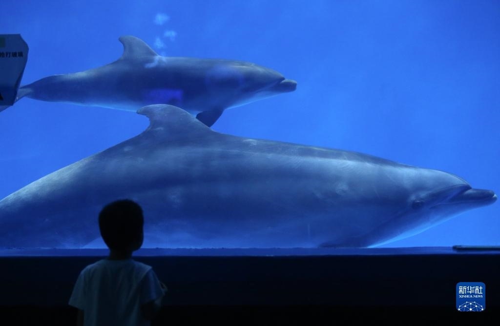 7月8日,一名小朋友在多彩貴州城極地海洋世界觀賞寬吻海豚。
