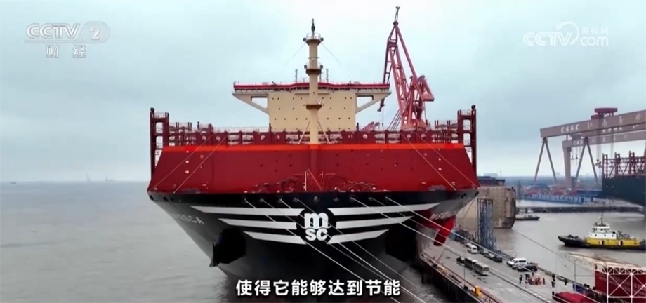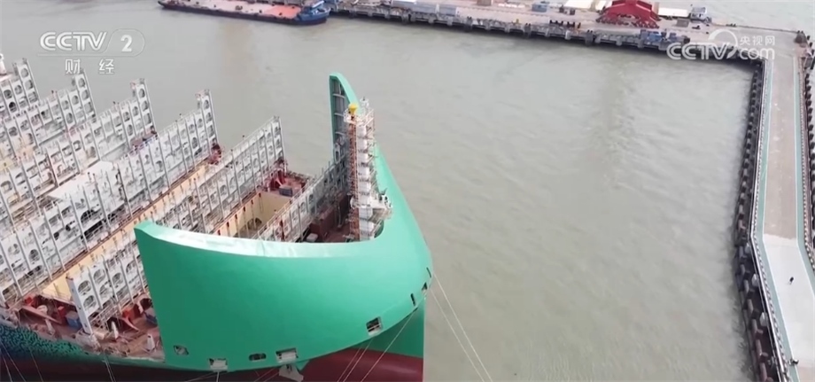 總臺(tái)央視記者 孟湛東:我現(xiàn)在是在中國船舶滬東中華造船廠的一艘13000箱的雙燃料集裝箱船上。這艘船除了使用傳統(tǒng)的石油燃料之外,還引入了液化天然氣,可以直接降低28%以上的溫室氣體排放。除此之外,在船頭還有一個(gè)獨(dú)特的設(shè)計(jì),各位可以看到一個(gè)綠色的防風(fēng)罩,工人們親切地稱它“綠頭怪”,這樣的設(shè)計(jì)可以讓船舶在正常行駛當(dāng)中降低2%左右的燃料消耗。