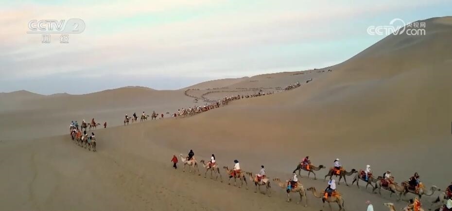 總臺記者 張磊:我現(xiàn)在所在的位置是敦煌的鳴沙山月牙泉景區(qū)。隨著暑期到來,當(dāng)?shù)氐穆糜稳藬?shù)也在不斷攀升。大家可以在我身后看到,游客現(xiàn)在正在騎著駱駝沿著鳴沙山腳下不斷蜿蜒穿行,場面顯得十分壯觀。以前,只有在小長假期間才會出現(xiàn)的“堵駱駝”的現(xiàn)象,這兩天已經(jīng)成為常態(tài)。
