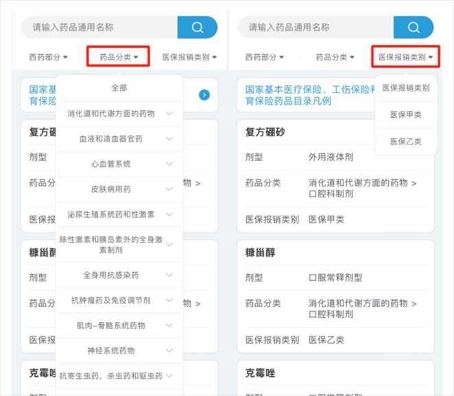也可以根據(jù)自己的需求,選擇“藥品分類”或“醫(yī)保報(bào)銷類別”進(jìn)行篩選。