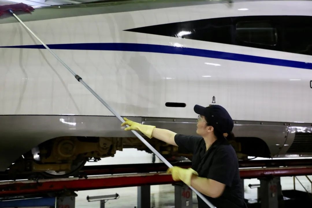 經(jīng)過(guò)自動(dòng)清洗的動(dòng)車(chē)組在開(kāi)進(jìn)動(dòng)車(chē)所檢修庫(kù)后,將由洗車(chē)人員進(jìn)行深度清潔。20多名洗車(chē)人員分工協(xié)作對(duì)動(dòng)車(chē)組車(chē)頂、車(chē)身等各部位進(jìn)行清洗。