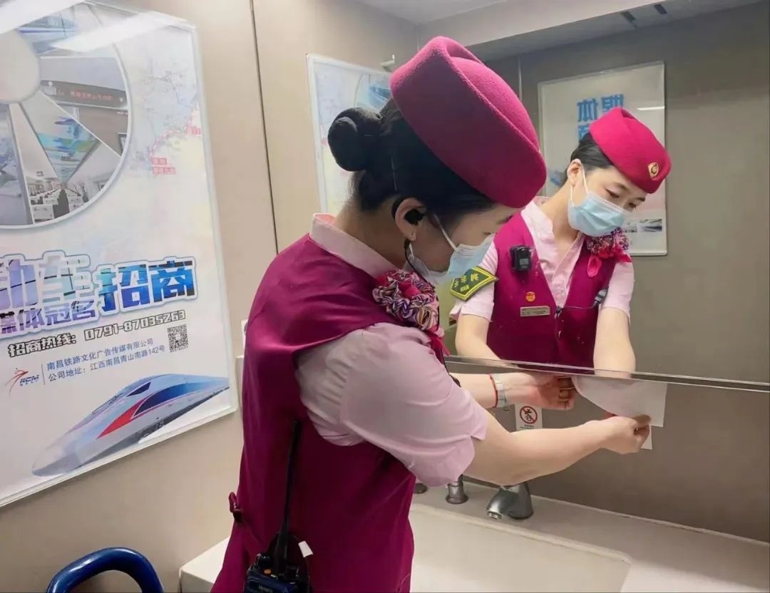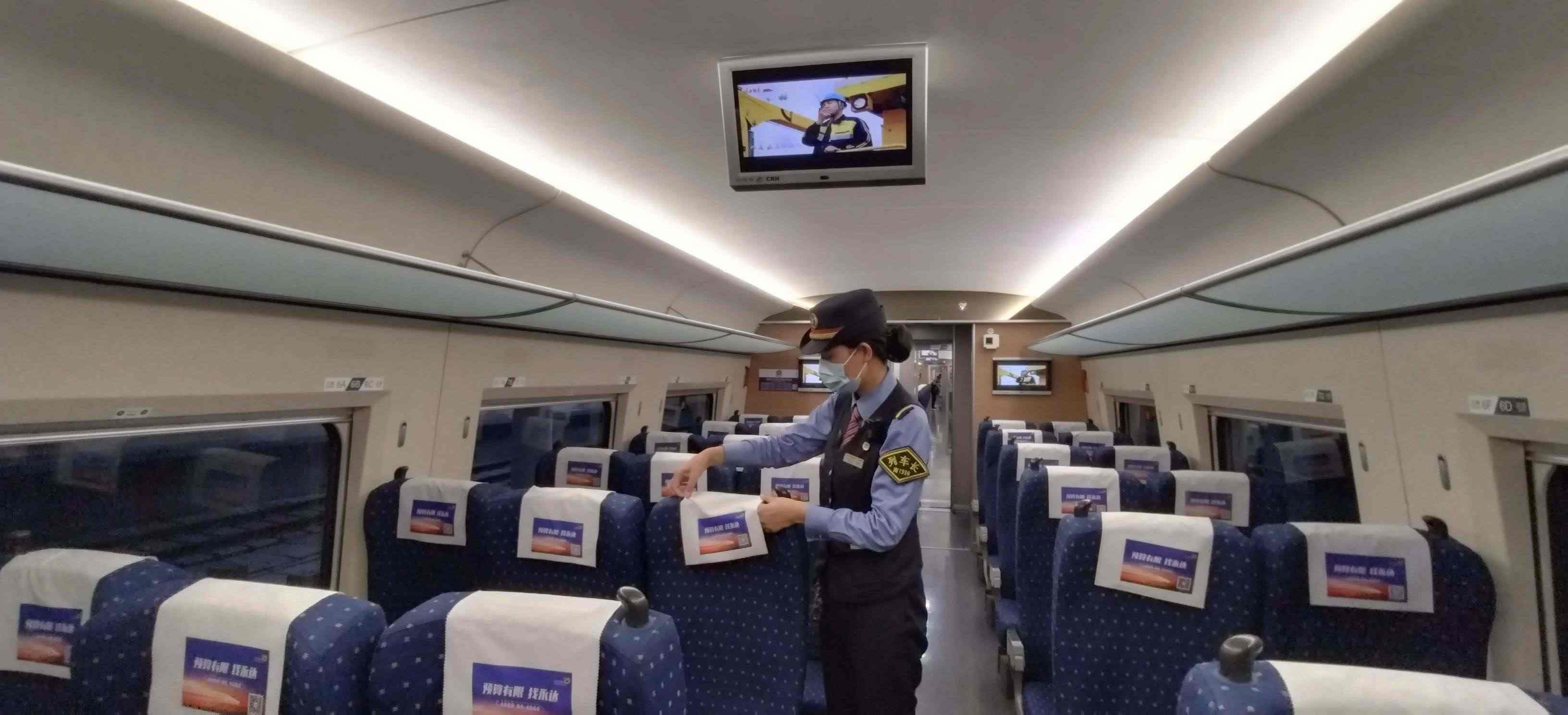 除了車(chē)身硬件的“美妝”,在列車(chē)上線始發(fā)前,列車(chē)乘務(wù)人員還要檢查各類客運(yùn)服務(wù)備品、衛(wèi)生備品等是否準(zhǔn)備齊全。他們需要保證車(chē)座椅背后網(wǎng)兜清潔袋擺放整齊,小桌板統(tǒng)一收起,頭枕巾和椅套擺放平整、干凈、無(wú)污染。