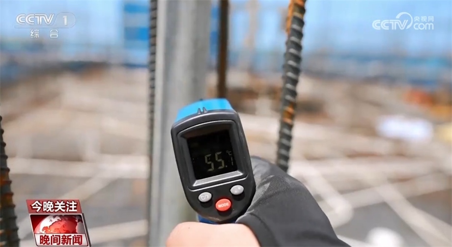 總臺(tái)央視記者 張鵬軍:我們來(lái)看一看這個(gè)鋼管的溫度,55℃,再來(lái)看這個(gè)樓頂木板的溫度,68.5℃。