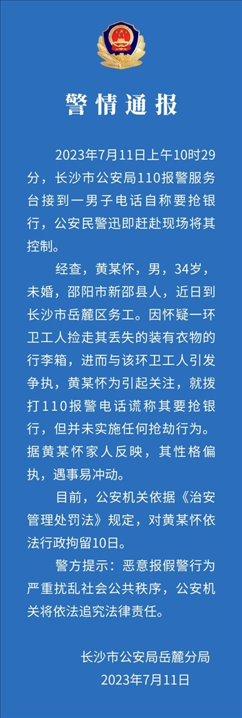·一人因與環(huán)衛(wèi)工人引發(fā)爭執(zhí),為引起關(guān)注,撥打110報警電話謊稱要搶銀行。長沙警方通報,對其依法行政拘留10日。