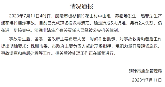 ·11日,湖南醴陵發(fā)生一起非法生產(chǎn)煙花爆竹爆炸事故,造成5人遇難,2人失聯(lián),涉嫌非法生產(chǎn)有關(guān)責(zé)任人已被公安機關(guān)控制,案件仍在進一步核實中。