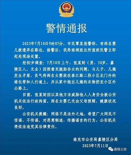·網(wǎng)傳“老人當(dāng)街遺棄雙胞胎女嬰”,警方:系負氣而為,已行拘。