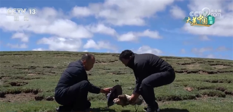 對峙了一會兒之后,加羊多杰找準機會,把帽子扣在幼鳥的頭上,然后把它抱起,準備送回鳥巢。