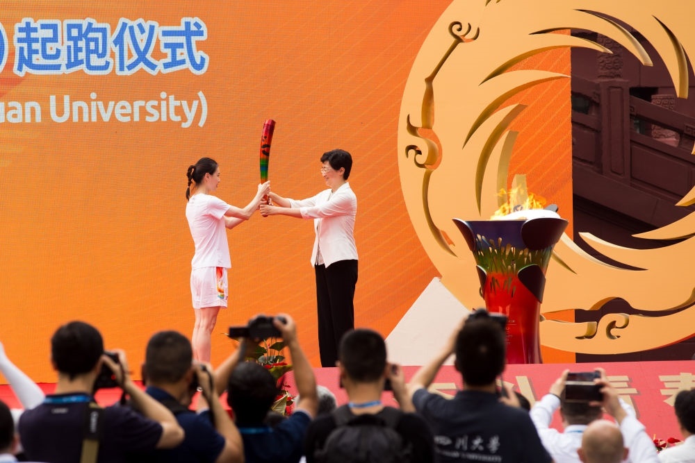7月2日,第一棒火炬手吳敏霞(左)接過點燃的火炬。當日,成都第31屆世界大學生夏季運動會火炬?zhèn)鬟f成都站起跑儀式在四川大學校園內(nèi)舉行。新華社發(fā)(曹鵬攝)