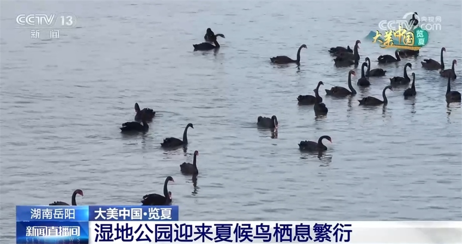 時(shí)值盛夏,湖南岳陽(yáng)湘陰的洋沙湖-東湖國(guó)家濕地公園引來大批夏候鳥來此棲息繁衍。碧波蕩漾、清荷搖曳,黑天鵝在此嬉戲覓食,麋鹿閑庭信步、悠然自得。