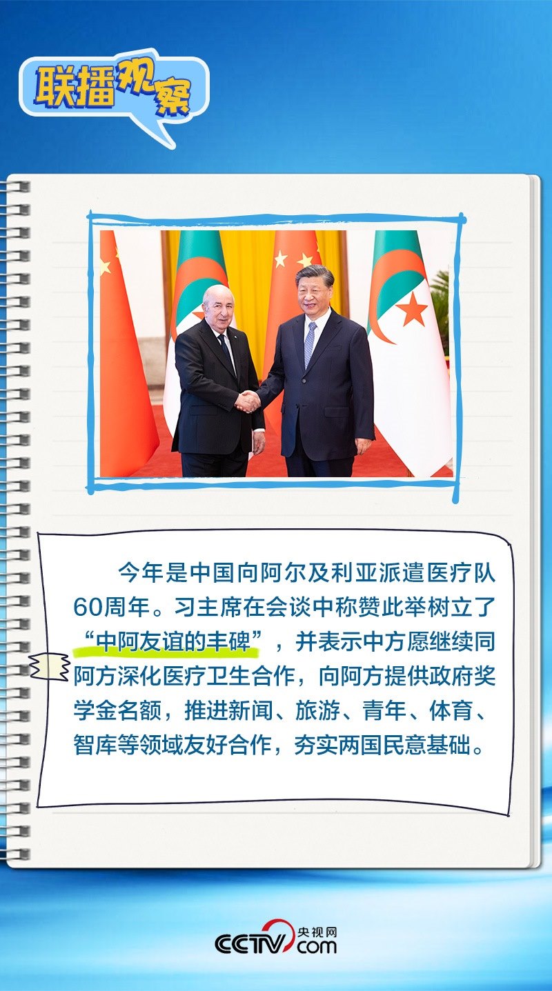 會談中,習(xí)主席特別提到,今年是中國向阿爾及利亞派遣醫(yī)療隊60周年,并稱贊此舉樹立了“中阿友誼的豐碑”。中阿傳統(tǒng)友誼深厚,兩國始終相互尊重、平等相待、彼此支持,締造了一段段友好交往的佳話。