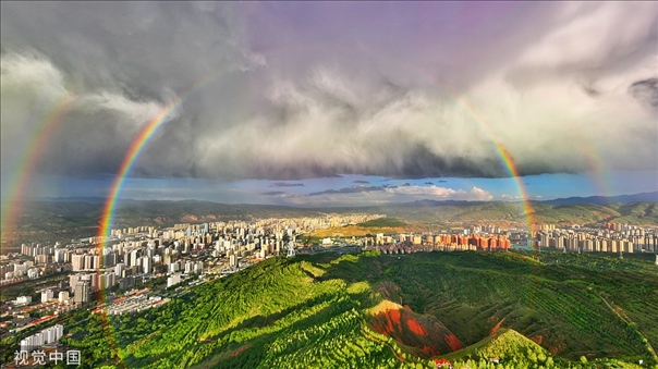 青海省西寧市一場(chǎng)云雨過(guò)后,天空出現(xiàn)雙彩虹。