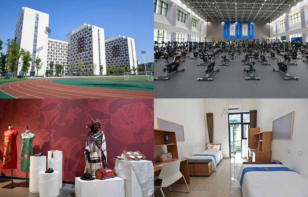 △左上圖是大運(yùn)村一處代表團(tuán)公寓。右上圖是大運(yùn)村健身中心的器械區(qū)。左下圖是大運(yùn)村展覽中心內(nèi)的特色服飾展區(qū)。右下圖是大運(yùn)村一間運(yùn)動(dòng)員宿舍。