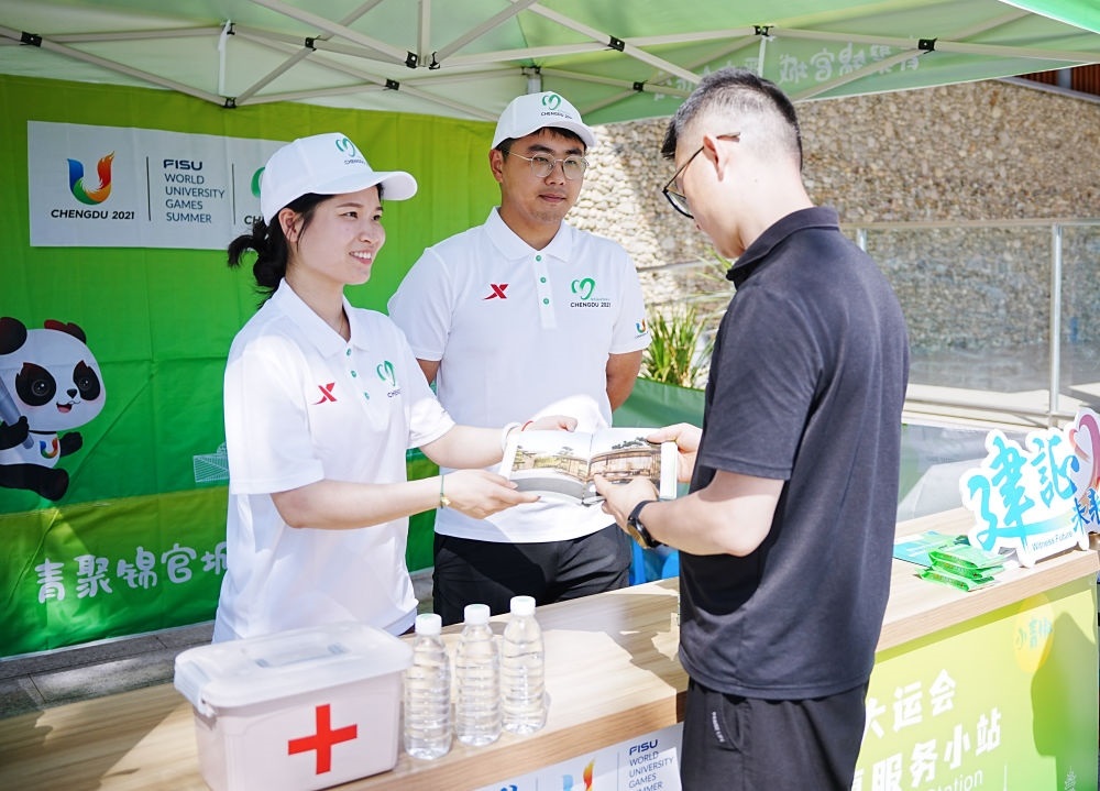 7月15日,在成都東部新區(qū)三岔湖的成都大運(yùn)會(huì)城市志愿服務(wù)小站,志愿者為游客介紹當(dāng)?shù)芈糜钨Y源。新華社記者 王曦 攝