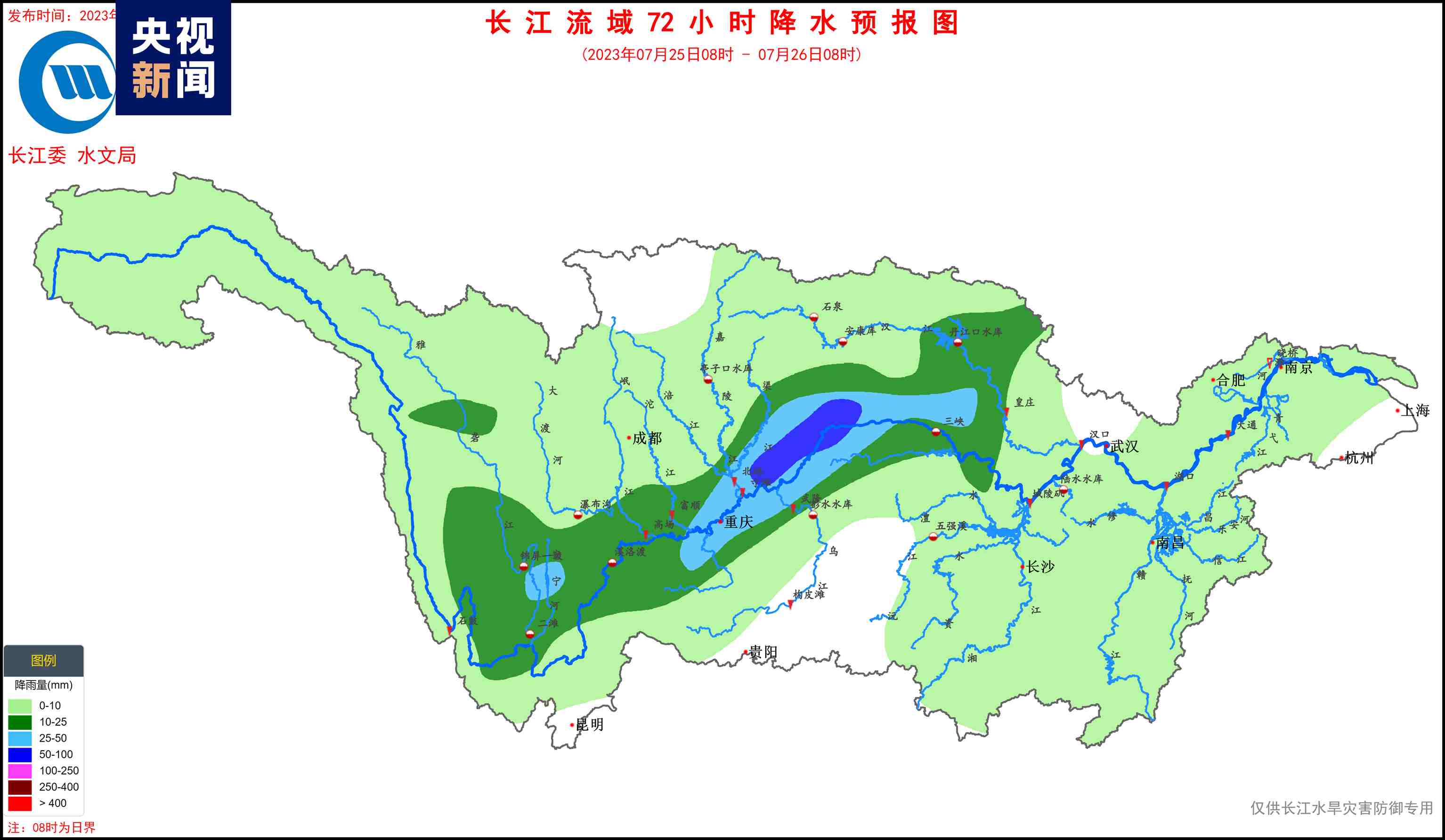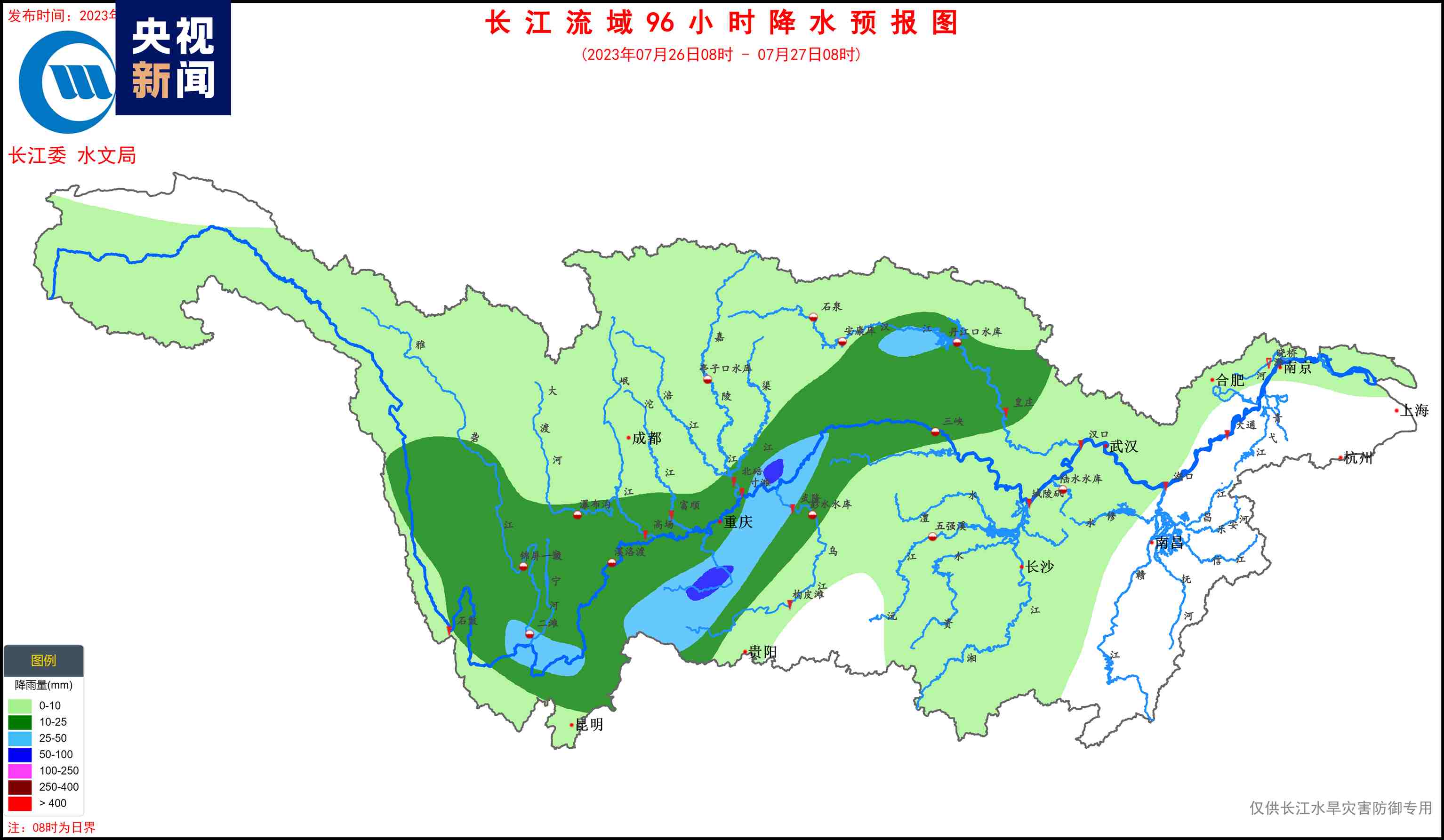 據(jù)水文氣象預(yù)報(bào),7月23日,嘉岷流域北部有中雨、局地大雨;24~27日,長(zhǎng)江上游干流附近有中到大雨、局地暴雨的降水過(guò)程,過(guò)程累計(jì)面雨量:長(zhǎng)江上游干流70毫米,金沙江中下游、雅礱江、岷沱江、渠江、烏江上游30~50毫米??紤]預(yù)見期降雨,金沙江中下游、嘉岷流域、赤水河、烏江、三峽區(qū)間將發(fā)生漲水過(guò)程,降雨落區(qū)內(nèi)部分中小河流可能發(fā)生超警洪水,局部強(qiáng)降雨引發(fā)山洪災(zāi)害的風(fēng)險(xiǎn)高。