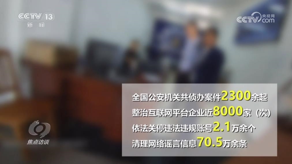 今年4月以來,公安部網(wǎng)安局部署開展為期100天的網(wǎng)絡(luò)謠言打擊整治專項(xiàng)行動,全國公安機(jī)關(guān)共偵辦案件2300余起,整治互聯(lián)網(wǎng)平臺企業(yè)近8000家(次),依法關(guān)停違法違規(guī)賬號2.1萬余個,清理網(wǎng)絡(luò)謠言信息70.5萬余條,對網(wǎng)絡(luò)謠言違法犯罪形成強(qiáng)大震懾。