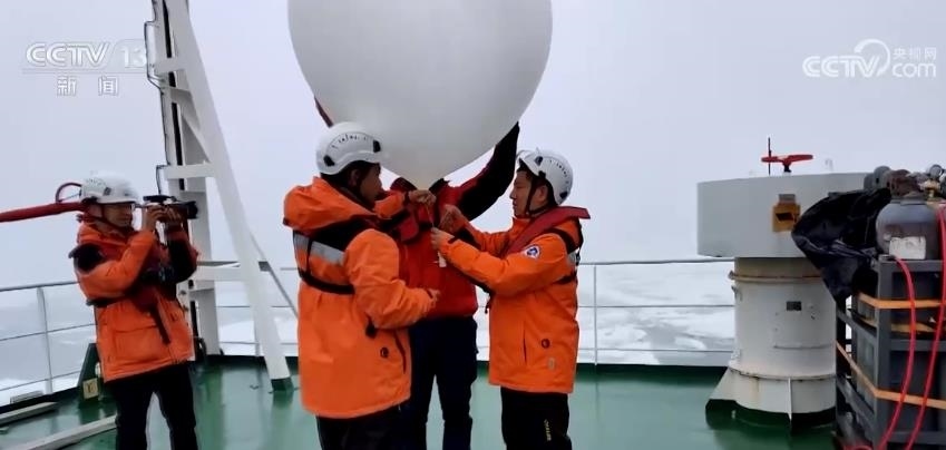 在“雪龍2”號(hào)的9層甲板,大氣環(huán)境組的科考隊(duì)員們正在為氣象探空氣球充氣,這個(gè)氣球?qū)y帶無(wú)線電探空儀,飛到兩三萬(wàn)米的高空,探測(cè)大氣自下而上的溫度、濕度、氣壓、風(fēng)向、風(fēng)速等數(shù)據(jù)。