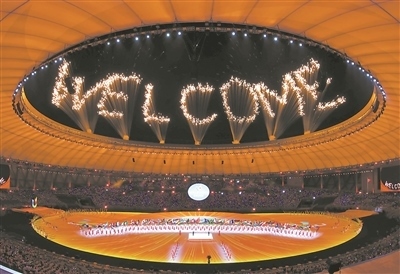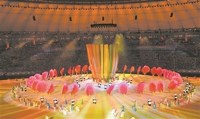 開幕式上,“太陽神鳥”穿越時空翩飛而至,4只神鳥圍繞旋轉的太陽飛翔。12道金色光芒漸次點亮,點亮了整個體育場。
