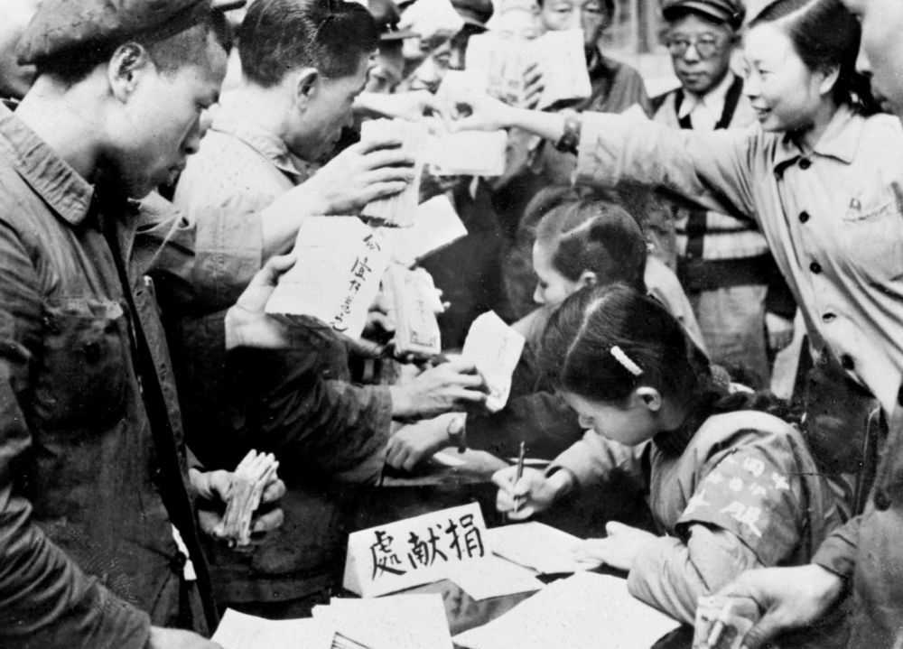 全國各地工商界踴躍捐獻(xiàn)款項,支援志愿軍。這是重慶市工商業(yè)者捐獻(xiàn)的情形。新華社發(fā)(資料照片)