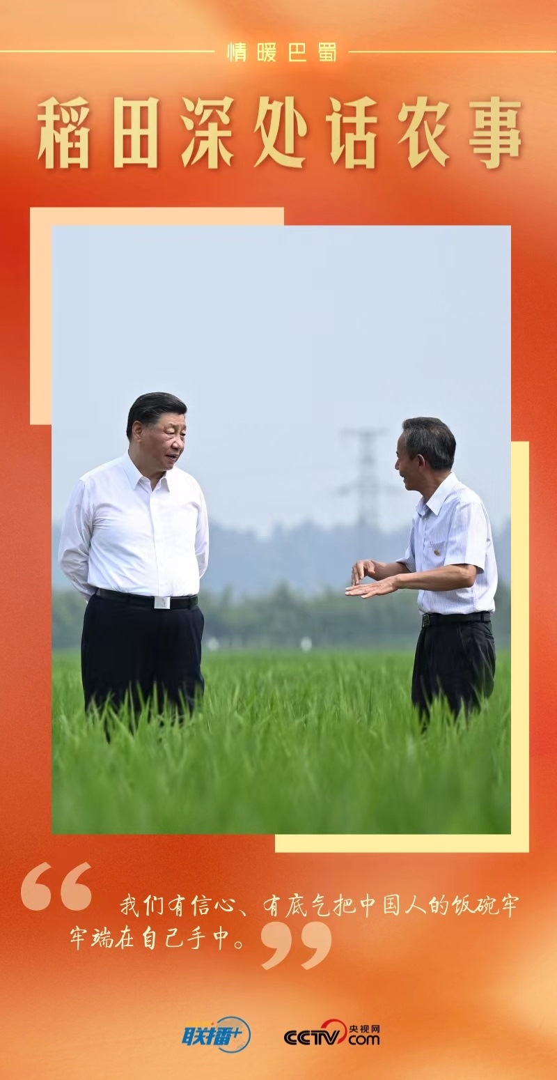 遠(yuǎn)眺廣袤田野,總書記思慮深遠(yuǎn):“民以食為天。推進(jìn)農(nóng)業(yè)現(xiàn)代化,既要靠我們中國(guó)的農(nóng)業(yè)專家,也要靠我們中國(guó)的農(nóng)民,我們有信心、有底氣實(shí)現(xiàn)糧食安全的目標(biāo)。四川要把農(nóng)業(yè)搞好,把糧食生產(chǎn)抓好。”