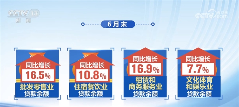 數(shù)據(jù)顯示,6月末,批發(fā)零售業(yè)、住宿餐飲業(yè)、租賃和商務(wù)服務(wù)業(yè)、文化體育和娛樂業(yè)貸款余額同比分別增長16.5%、10.8%、16.9%、7.7%,信用卡、汽車和其他綜合消費貸款比年初增加7100多億元,有力支持了相關(guān)領(lǐng)域消費恢復發(fā)展。