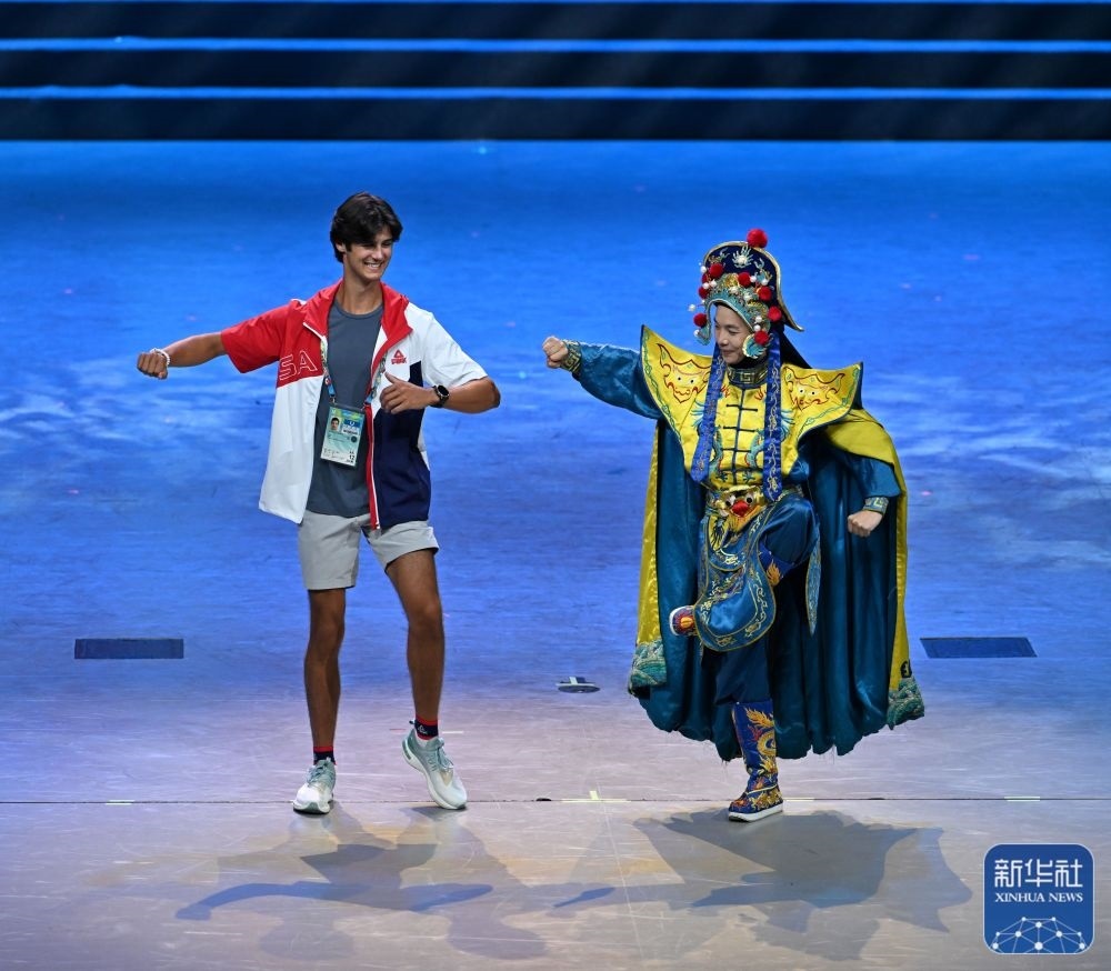 ↑7月29日,美國運(yùn)動員杜恩(左)在聯(lián)歡會現(xiàn)場與川劇演員互動。新華社記者 蔡湘鑫 攝