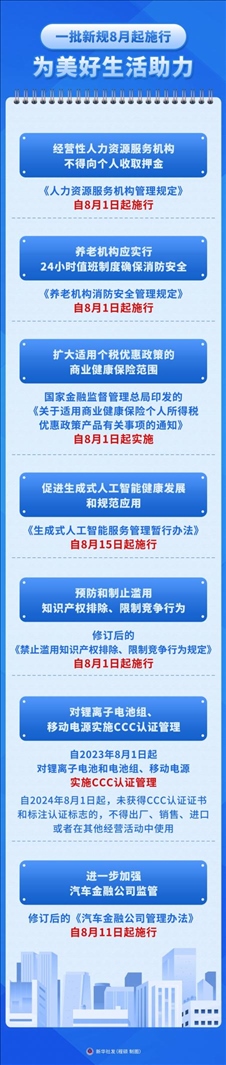 ·一批民生新規(guī)8月開始施行。從完善人力資源服務(wù)機構(gòu)管理,到強化養(yǎng)老機構(gòu)消防安全;從擴大適用個稅優(yōu)惠政策的商業(yè)健康保險范圍,到規(guī)范生成式人工智能服務(wù)……法治,為美好生活助力。