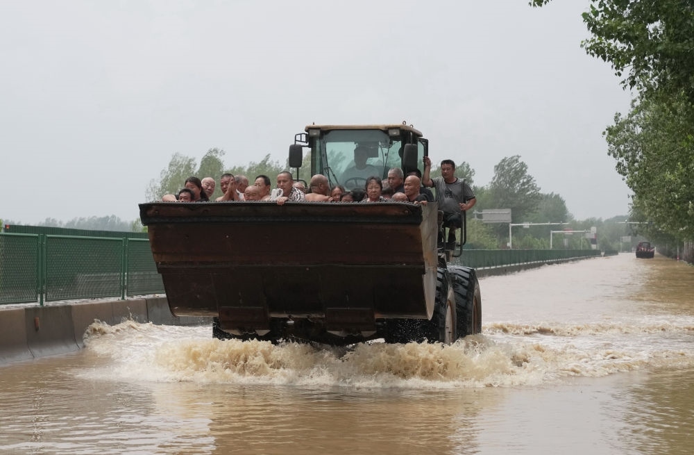 7月31日,在河北省邢臺(tái)市寧晉縣,救援人員使用工程機(jī)械設(shè)備轉(zhuǎn)運(yùn)北沙良村村民。新華社記者 楊世堯 攝