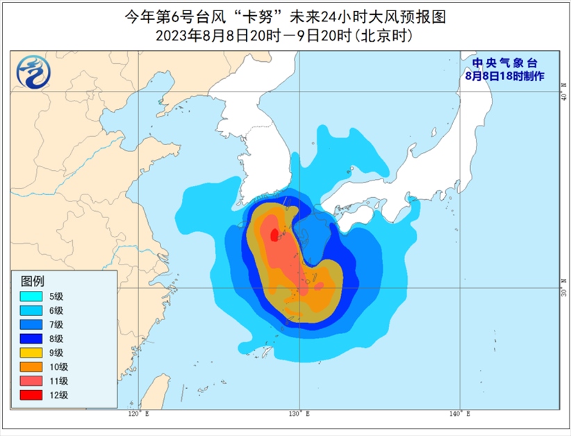 受“卡努”影響,8月8日至9日,巴士海峽、臺灣海峽北部、臺灣以東洋面、東海南部和東部及釣魚島附近海域有6級至7級大風,東海東部部分海域風力可達8級至10級,“卡努”中心經過的附近海域風力可達11級至12級,陣風13級至14級。