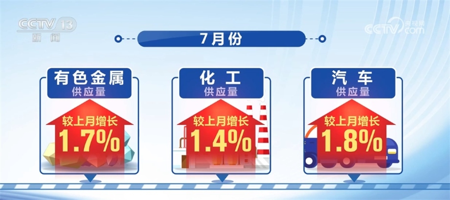7月份,鋼鐵、煤炭和成品油供應量較上月分別增加4.6%、7.3%和4.1%,增速較上月分別加快1.4、1.1和1.3個百分點。有色金屬、化工和汽車供應量較上月分別增長1.7%、1.4%和1.8%。