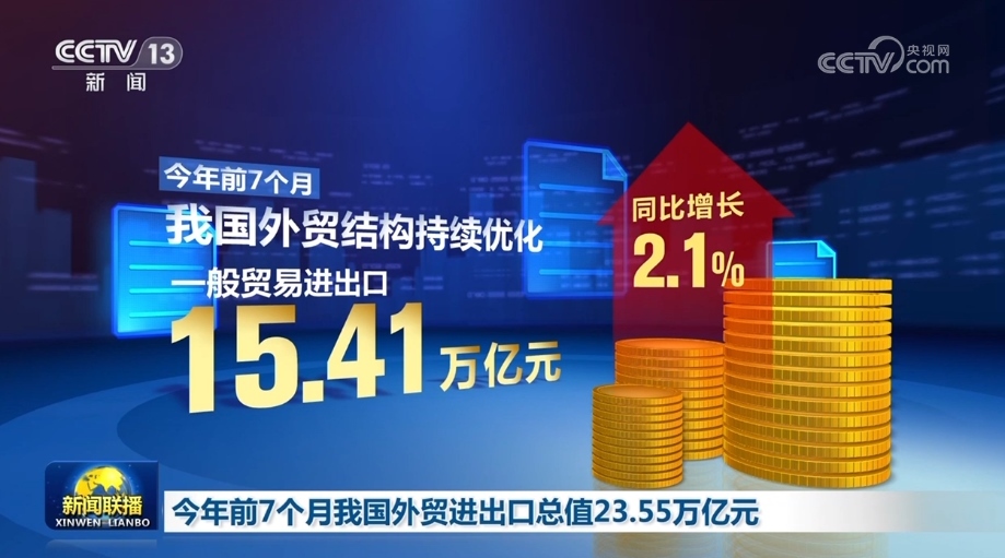 央視網(wǎng)消息(新聞聯(lián)播):海關(guān)總署今天(8月8日)對(duì)外公布,今年前7個(gè)月,我國貨物貿(mào)易進(jìn)出口總值23.55萬億元,外貿(mào)運(yùn)行平穩(wěn)、符合預(yù)期。