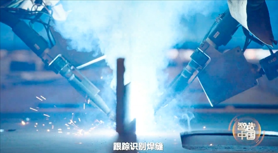 機(jī)器人測(cè)量鋼板尺寸和位置,大腦根據(jù)數(shù)據(jù)迅速發(fā)出指令,焊槍上的激光感應(yīng)器跟蹤識(shí)別焊縫,實(shí)時(shí)糾偏。