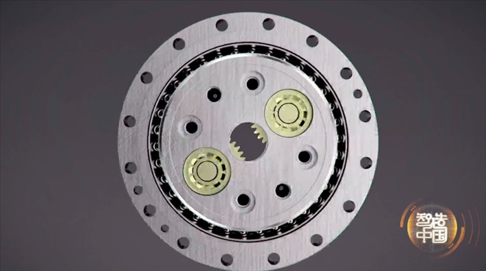 打開RV減速機(jī),里面就像一個(gè)太陽系,既有太陽輪,也有行星輪。這就是RV減速機(jī)的擺線行星輪,它們就像圍繞太陽的行星,既有自轉(zhuǎn)也有公轉(zhuǎn),自轉(zhuǎn)一圈的同時(shí)公轉(zhuǎn)40圈,通過多組行星運(yùn)動(dòng)實(shí)現(xiàn)精密傳動(dòng),把電機(jī)的高速轉(zhuǎn)動(dòng)降下來,同時(shí)增大轉(zhuǎn)矩,驅(qū)動(dòng)機(jī)器人手臂旋轉(zhuǎn)。