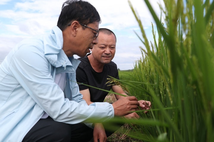 8月11日,黑龍江省尚志市農(nóng)業(yè)技術(shù)推廣中心的工作人員在當(dāng)?shù)匾惶幈缓樗葸^的水稻田里查看水稻情況。新華社記者 張濤 攝