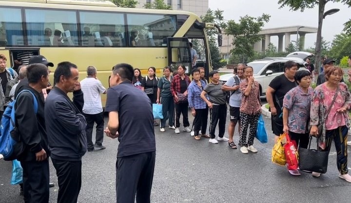 “不著急,慢點(diǎn)兒下,咱這兒有住的、有吃的?!眮碜晕宄J忻駱粪l(xiāng)的群眾陸續(xù)走下大巴車,已有工作人員等在車前。