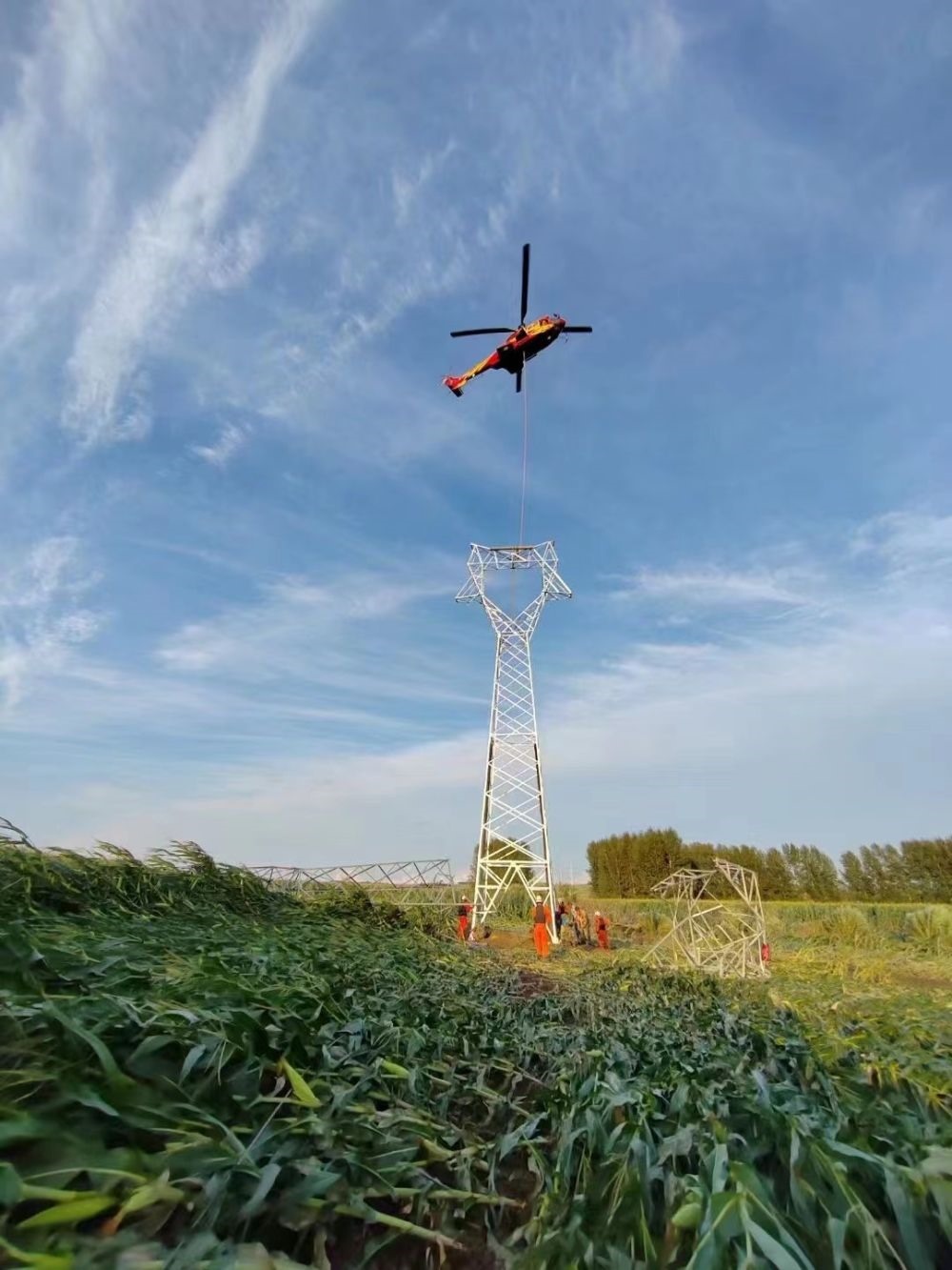 9日,在海林市110千伏長海輸電線路搶修現(xiàn)場,一架直升機(jī)吊裝起沉重的輸電鐵塔,運(yùn)送到指定地點(diǎn)。這個(gè)輸電鐵塔處于河流中心島位置,無法使用常規(guī)起重設(shè)備。國家電網(wǎng)公司迅速從國網(wǎng)遼寧電力、國網(wǎng)空間技術(shù)公司等單位調(diào)配直升機(jī)支援黑龍江,解決輸電鐵塔吊裝、運(yùn)輸?shù)葐栴}。