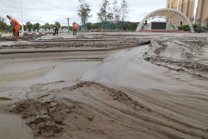 鏟車鏟起路上的大塊淤泥倒入翻斗車,工人們有的手拿鐵鍬清理人行道,有的用水槍沖刷路面……9日下午,在尚志市東浦新區(qū)一座公園附近的道路上,洪水退去后的清淤工作正在進(jìn)行。