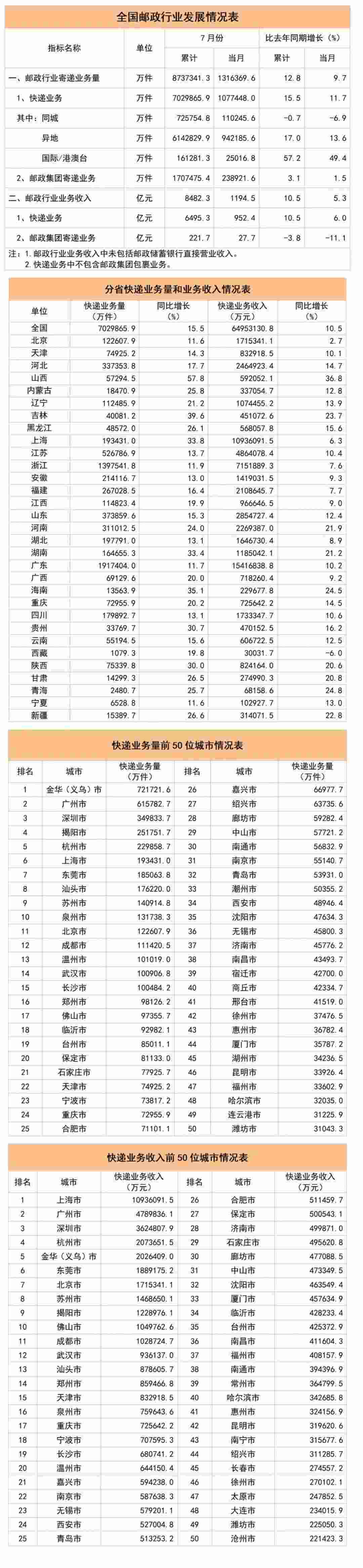 國家郵政局:1-7月郵政行業(yè)寄遞業(yè)務(wù)量累計完成873.7億件,同比增長12.8%