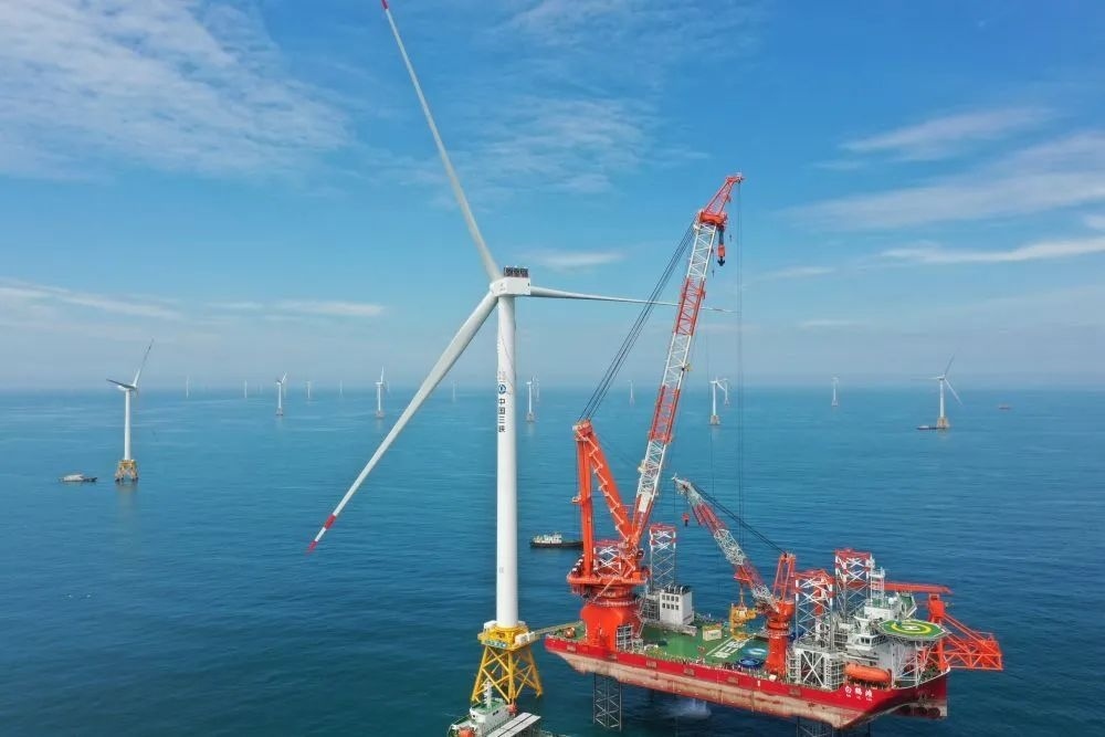 △福建北部海域,全球首臺16兆瓦海上風電機組吊裝現(xiàn)場。