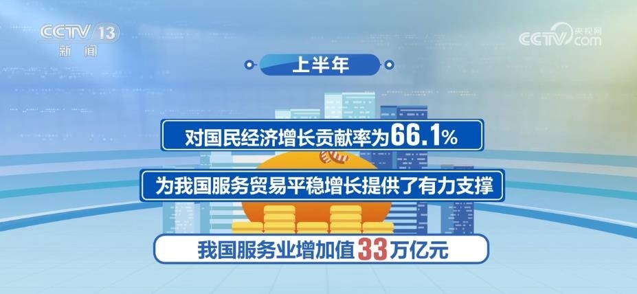 2023年以來,國民經(jīng)濟(jì)持續(xù)穩(wěn)定恢復(fù),服務(wù)業(yè)保持較快增長。上半年,我國服務(wù)業(yè)增加值33萬億元,同比增長6.4%,占GDP比重為56%,高于上年同期1.6個百分點(diǎn),對國民經(jīng)濟(jì)增長貢獻(xiàn)率為66.1%,為我國服務(wù)貿(mào)易平穩(wěn)增長提供了有力支撐。