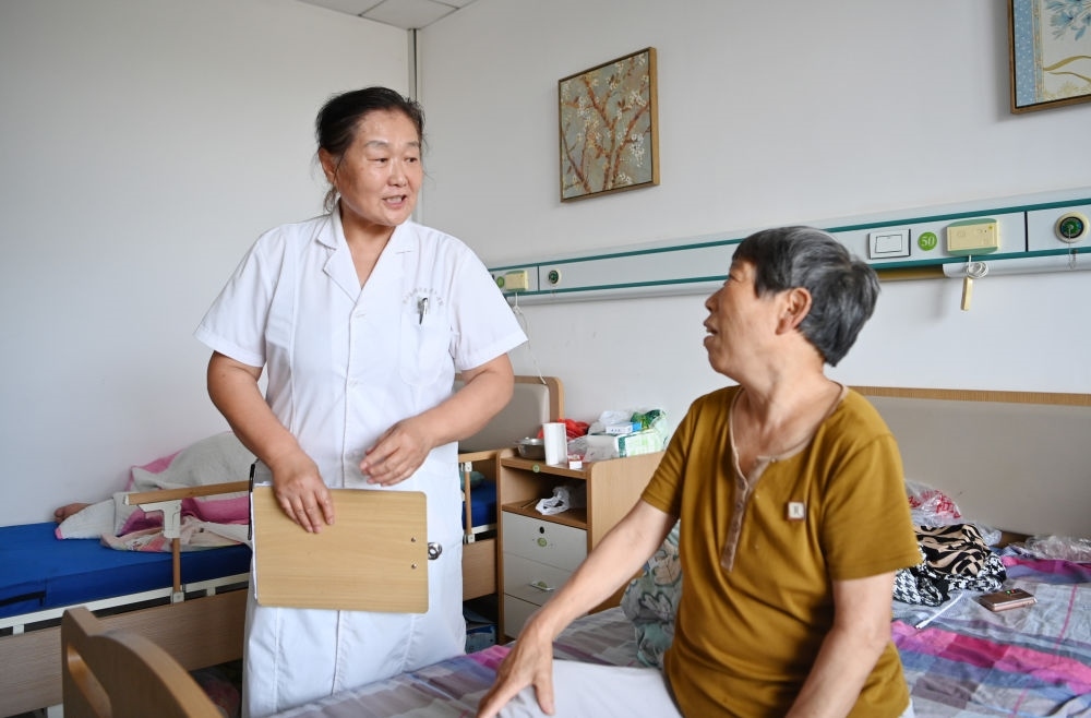 醫(yī)務(wù)人員在海福祥養(yǎng)老護理院安置點內(nèi)叮囑轉(zhuǎn)移老人用藥(8月9日攝)。新華每日電訊記者李然攝