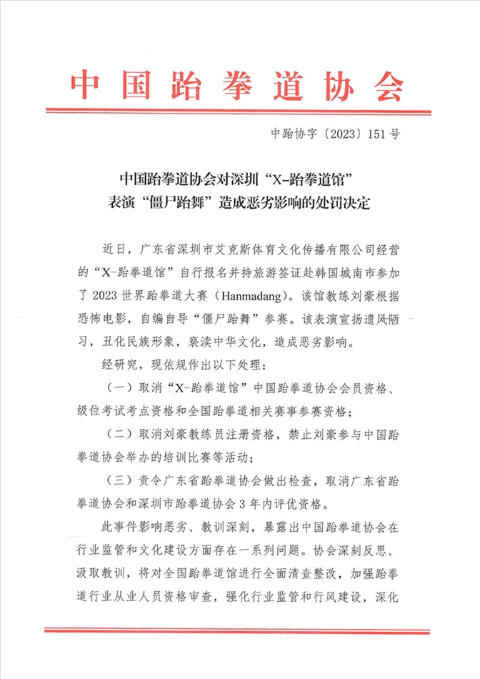 ·在韓表演“僵尸跆舞”跆拳道館被中國跆拳道協(xié)會(huì)處罰:取消會(huì)員和賽事參賽資格。