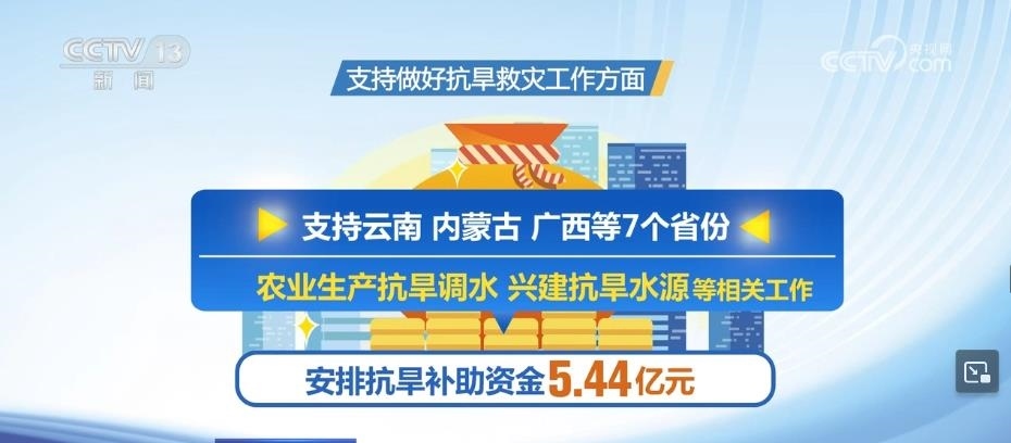 在支持做好抗旱救災(zāi)工作方面,安排抗旱補(bǔ)助資金5.44億元,支持云南、內(nèi)蒙古、廣西等7個(gè)省份,開(kāi)展農(nóng)業(yè)生產(chǎn)抗旱調(diào)水、興建抗旱水源等相關(guān)工作。 ?