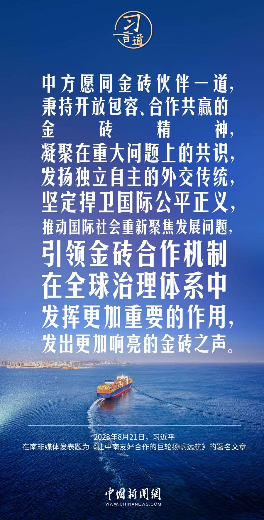 8月21日,在赴約翰內(nèi)斯堡出席金磚國家領(lǐng)導(dǎo)人第十五次會(huì)晤并對(duì)南非進(jìn)行國事訪問之際,國家主席習(xí)近平在南非《星報(bào)》、《開普時(shí)報(bào)》、《水星報(bào)》和南非獨(dú)立媒體網(wǎng)站發(fā)表題為《讓中南友好合作的巨輪揚(yáng)帆遠(yuǎn)航》的署名文章。習(xí)近平指出——