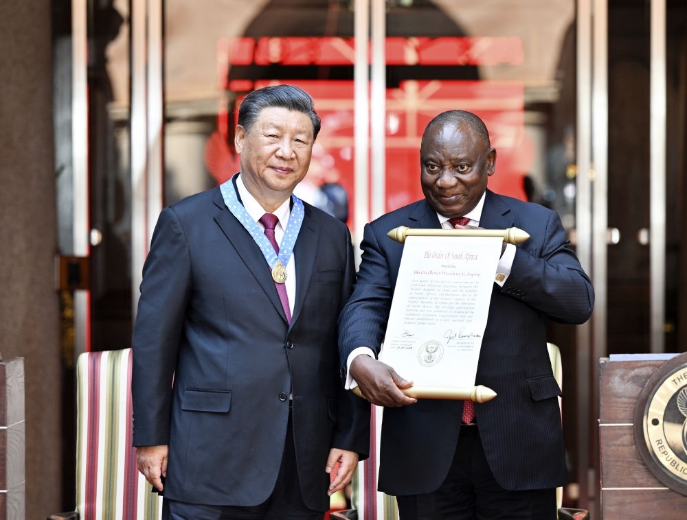 會談后,拉馬福薩向習(xí)近平授予“南非勛章”,這是南非授予重要友好國家元首的最高級別勛章和最高榮譽。