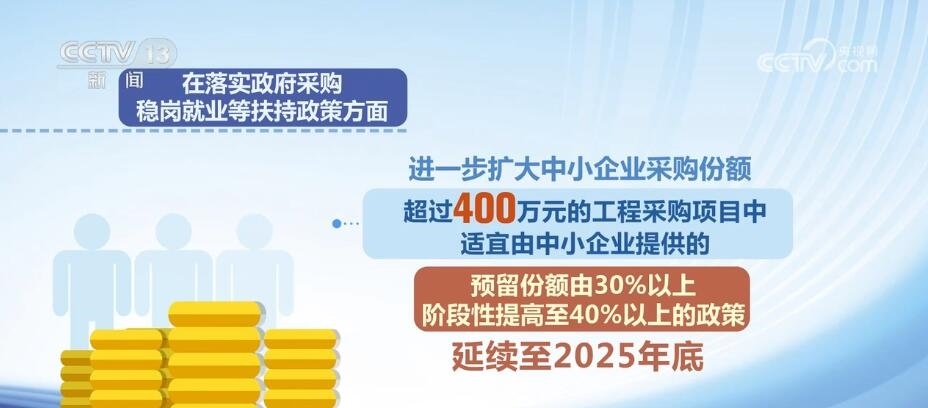 在落實(shí)政府采購(gòu)、穩(wěn)崗就業(yè)等扶持政策方面,進(jìn)一步擴(kuò)大中小企業(yè)采購(gòu)份額,超過(guò)400萬(wàn)元的工程采購(gòu)項(xiàng)目中適宜由中小企業(yè)提供的,預(yù)留份額由30%以上階段性提高至40%以上的政策延續(xù)至2025年底;中小微企業(yè)招用符合條件的畢業(yè)年度或離校2年內(nèi)未就業(yè)高校畢業(yè)生、登記失業(yè)青年,簽訂1年以上勞動(dòng)合同的,可按規(guī)定申請(qǐng)一次性吸納就業(yè)補(bǔ)貼;符合條件的中小微企業(yè)可按不超過(guò)企業(yè)及其職工上年度實(shí)際繳納失業(yè)保險(xiǎn)費(fèi)的60%申請(qǐng)失業(yè)保險(xiǎn)穩(wěn)崗返還;對(duì)招用畢業(yè)年度和離校2年內(nèi)未就業(yè)高校畢業(yè)生的小微企業(yè),按規(guī)定落實(shí)社會(huì)保險(xiǎn)補(bǔ)貼政策。