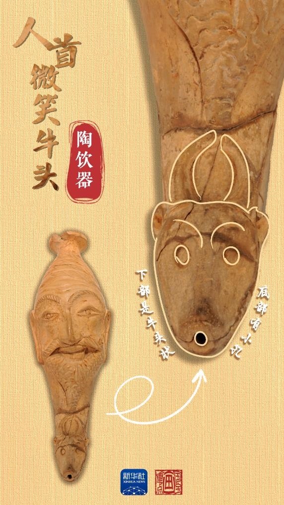 當中國絲綢的美譽經(jīng)由古絲綢之路在西亞、歐洲等地傳揚時,西方文明也穿過風沙與長歌,在中國留下了印記。人首微笑牛頭陶飲器出土于和田地區(qū)約特干遺址,為唐代時期文物。飲器上部為人首形,下部是牛頭狀,底部帶小圓孔,上下兩部分內(nèi)腔相通。人首上唇胡須外展卷翹,面帶微笑。牛頭微微上翹,牛角豎立攏圓。這種飲器造型源自“來通”,即末端為動物形或人首形的角杯,是小亞細亞和地中海地區(qū)常見的飲酒器具,絲綢之路沿線國家都有類似文物出土。