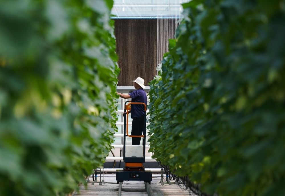 2023年7月26日,在山東濰坊壽光市丹河設(shè)施蔬菜標(biāo)準(zhǔn)化生產(chǎn)示范園,農(nóng)民在管護作物。新華社記者 張浩波 攝