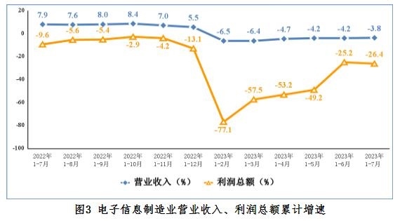 1—7月份,規(guī)模以上電子信息制造業(yè)實現(xiàn)營業(yè)收入7.98萬億元,同比下降3.8%,較上半年降幅收窄0.4個百分點;營業(yè)成本6.98萬億元,同比下降3.3%;實現(xiàn)利潤總額2763億元,同比下降26.4%,較上半年降幅加深1.2個百分點;營業(yè)收入利潤率為3.5%,較上半年下降0.1個百分點。