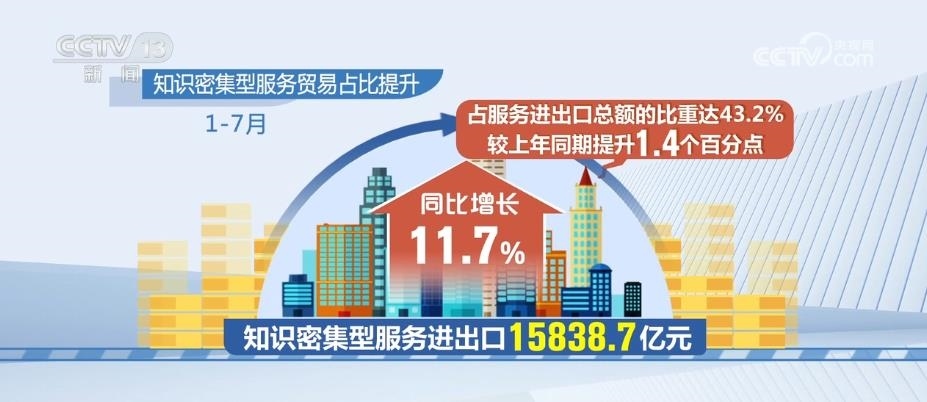 知識密集型服務(wù)貿(mào)易占比提升。1月—7月,知識密集型服務(wù)進(jìn)出口15838.7億元,同比增長11.7%,占服務(wù)進(jìn)出口總額的比重達(dá)43.2%,較上年同期提升1.4個百分點(diǎn)。