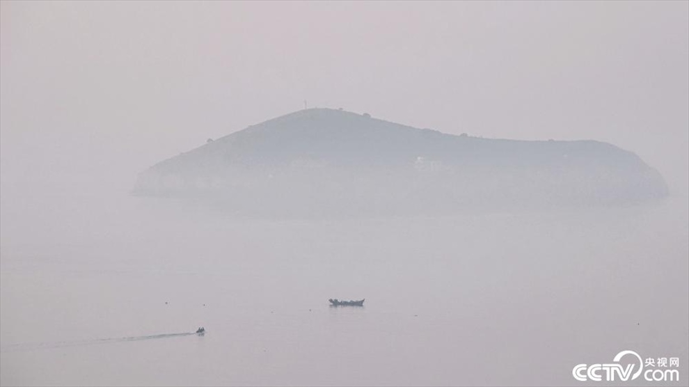 2023年9月3日清晨,大連,星海灣東部海域上空霧氣彌漫,島礁、漁船在霧中若隱若現(xiàn)。大連市氣象臺于當日03時57分發(fā)布了海上大霧橙色預警信號。